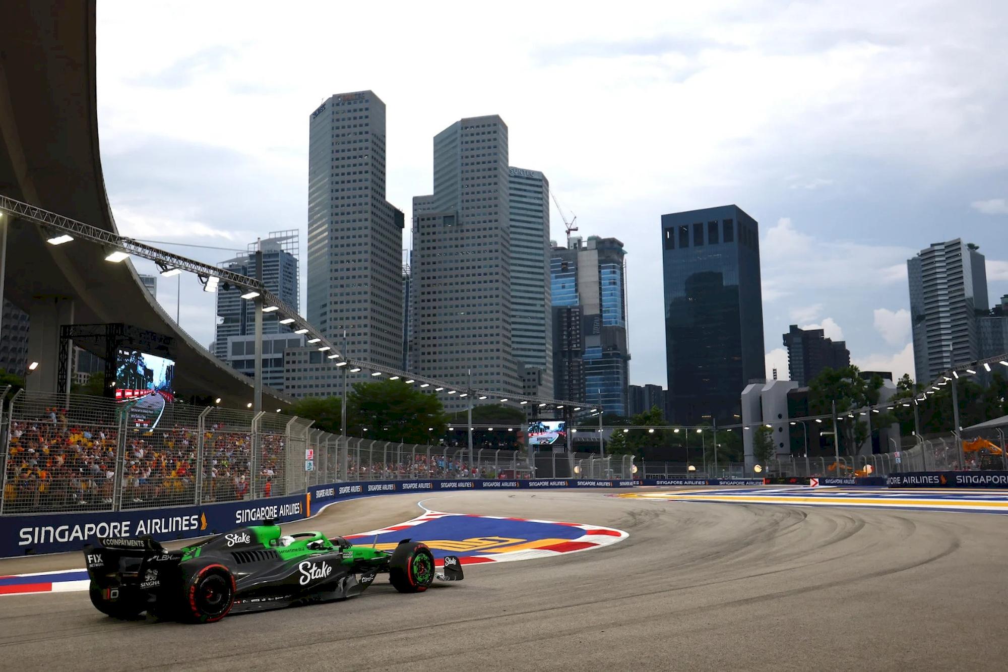 Poche ore prima della gara, alcuni scrosci di pioggia bagnano il circuito di Marina Bay. I piloti affrontano i giri di allineamento in griglia con gomme intermedie.